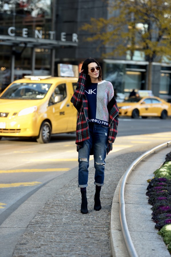 I recently pulled two of these distinct styles from my go-to contemporary fashion brand, Pinko. Since sometimes it’s all about feeling cozy in a classic, I chose this red tartan coat for a casual weekend of running errands in New York City.