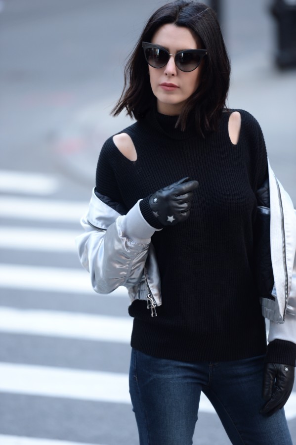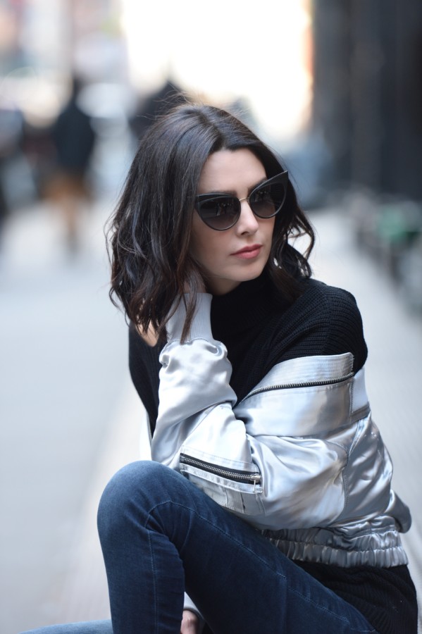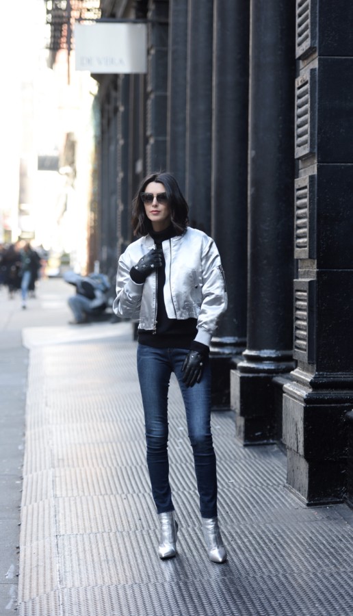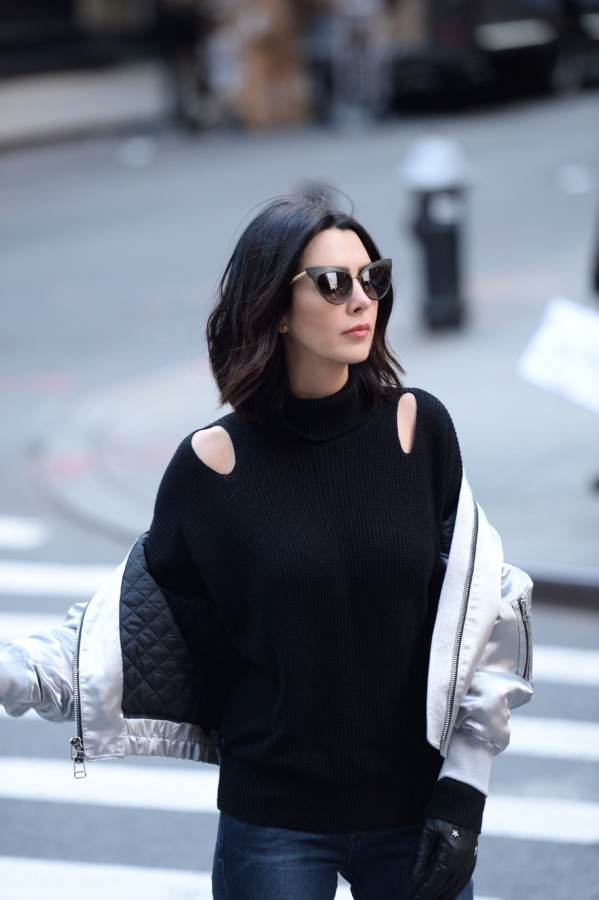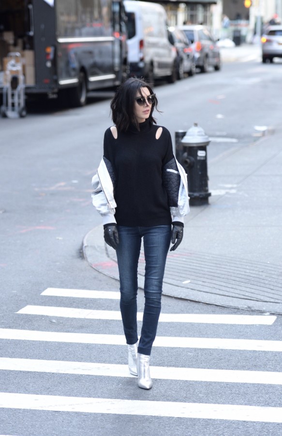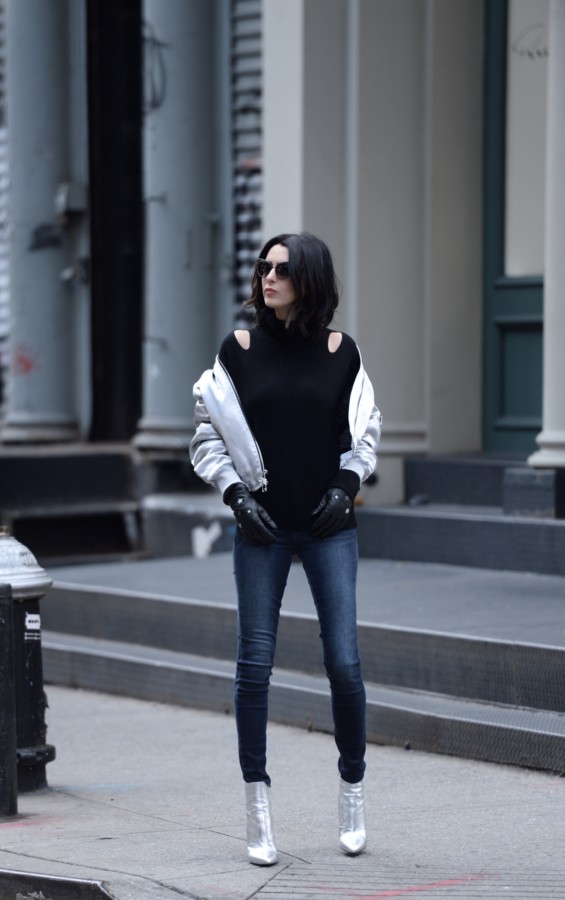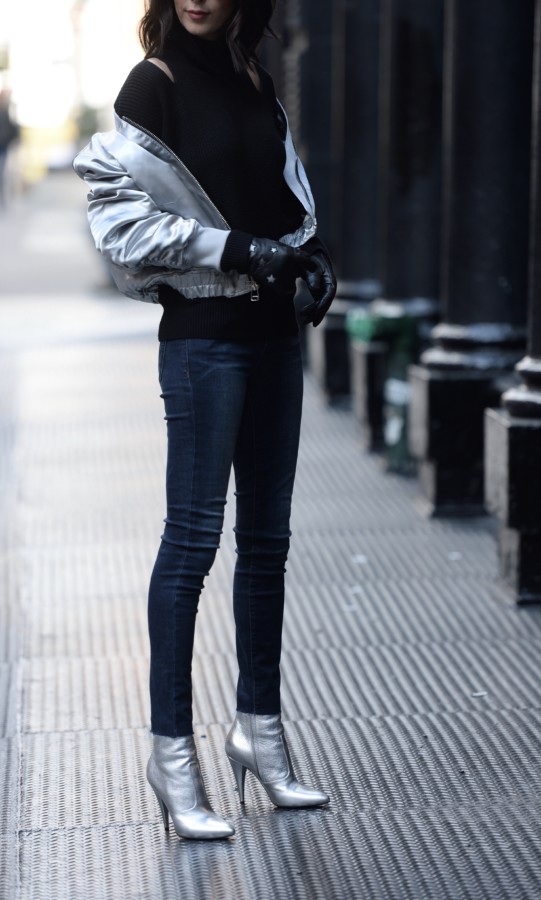 That said, I thought I’d share a more wearable way to embrace the futuristic metallic trend this season. To begin, find a pair of cropped denim jeans that are a good fit and will show off a set of silver booties (my ‘moon boots’ are by Saint Laurent from last year so I’ve included a selection of currently available boots at the very bottom of the page). I’ve chosen denim by Articles of Society because they have a stretchy fit and are typically priced below $100. Next, add a neutral-colored knit. I’ve been living in this black turtleneck with cutouts lately. Sweaters with unexpected cutouts are a great way to add edge to any basic look. Then, make the look lift-off-ready with a high-shine, silver bomber or puffer jacket. Lastly, add accessories that will complete your mission to defy gravity like these exaggerated cat eye sunglasses and leather star gloves.