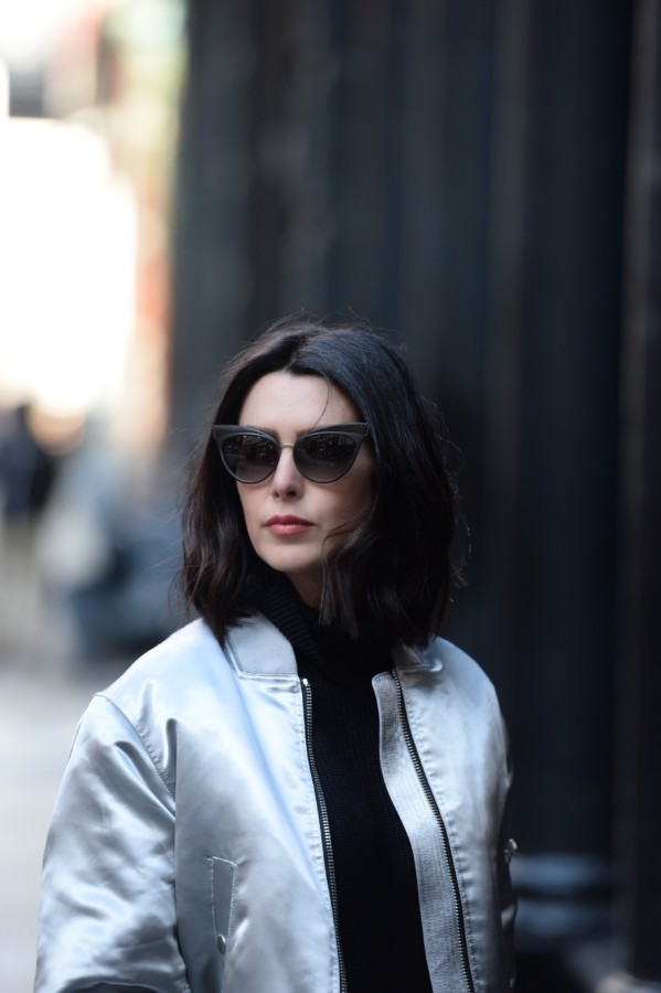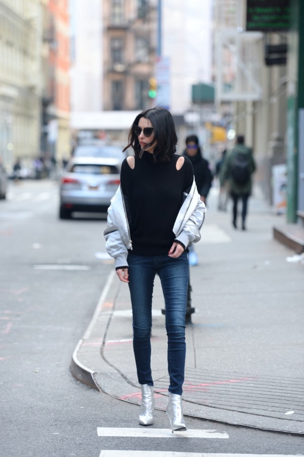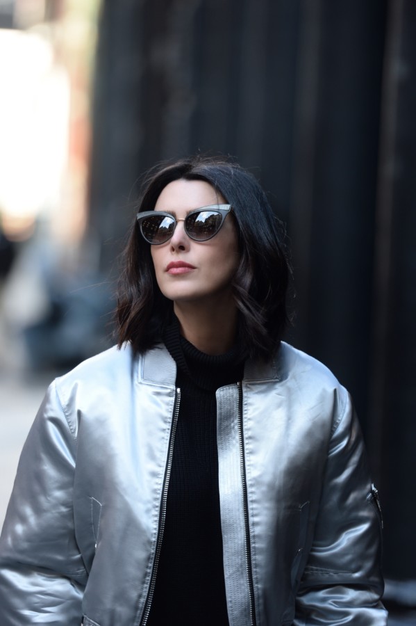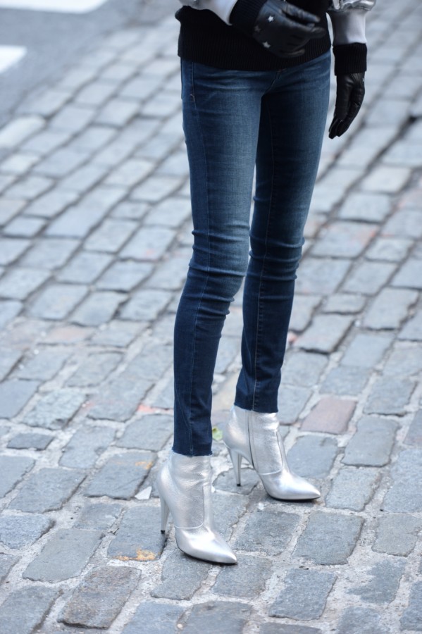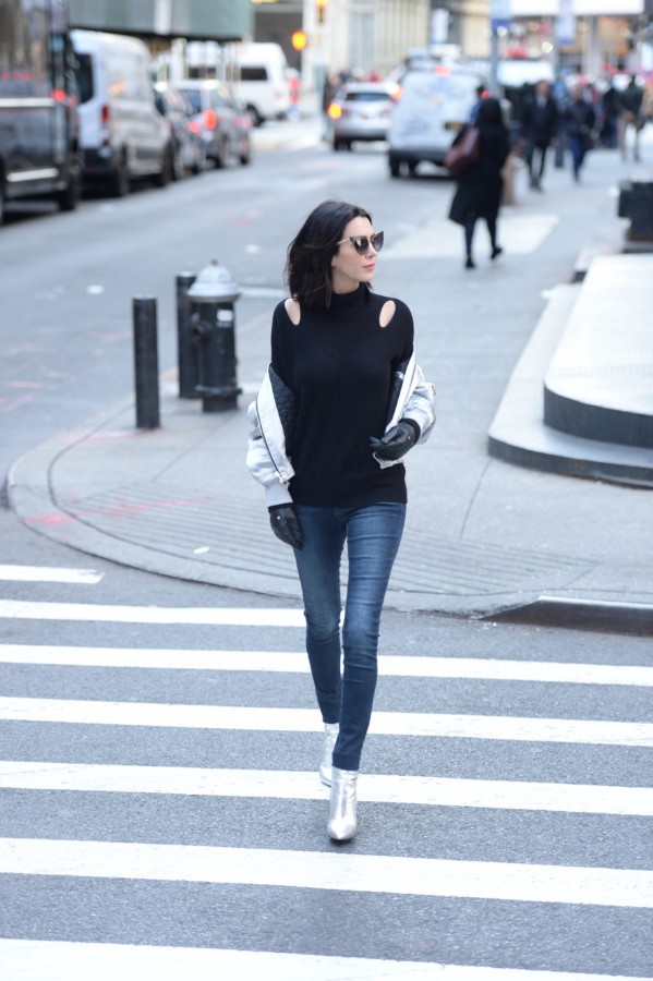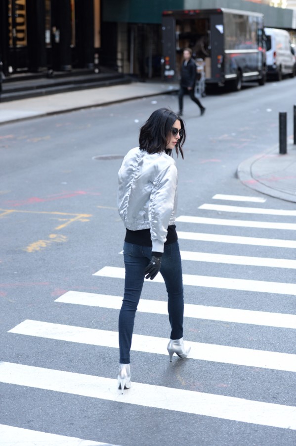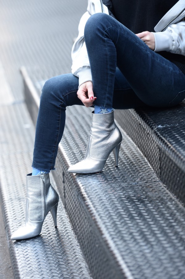 That said, I thought I’d share a more wearable way to embrace the futuristic metallic trend this season. To begin, find a pair of cropped denim jeans that are a good fit and will show off a set of silver booties (my ‘moon boots’ are by Saint Laurent from last year so I’ve included a selection of currently available boots at the very bottom of the page). I’ve chosen denim by Articles of Society because they have a stretchy fit and are typically priced below $100. Next, add a neutral-colored knit. I’ve been living in this black turtleneck with cutouts lately. Sweaters with unexpected cutouts are a great way to add edge to any basic look. Then, make the look lift-off-ready with a high-shine, silver bomber or puffer jacket. Lastly, add accessories that will complete your mission to defy gravity like these exaggerated cat eye sunglasses and leather star gloves.