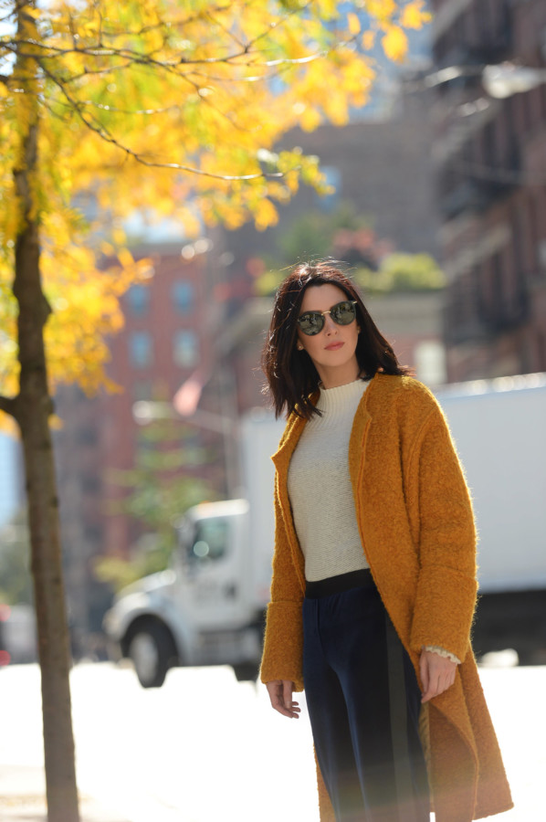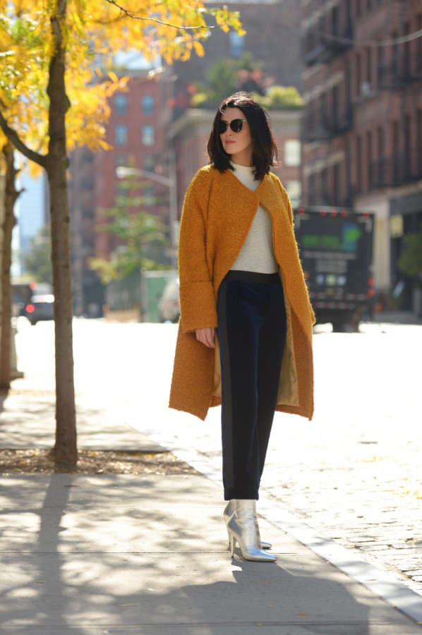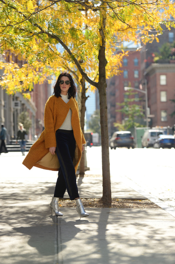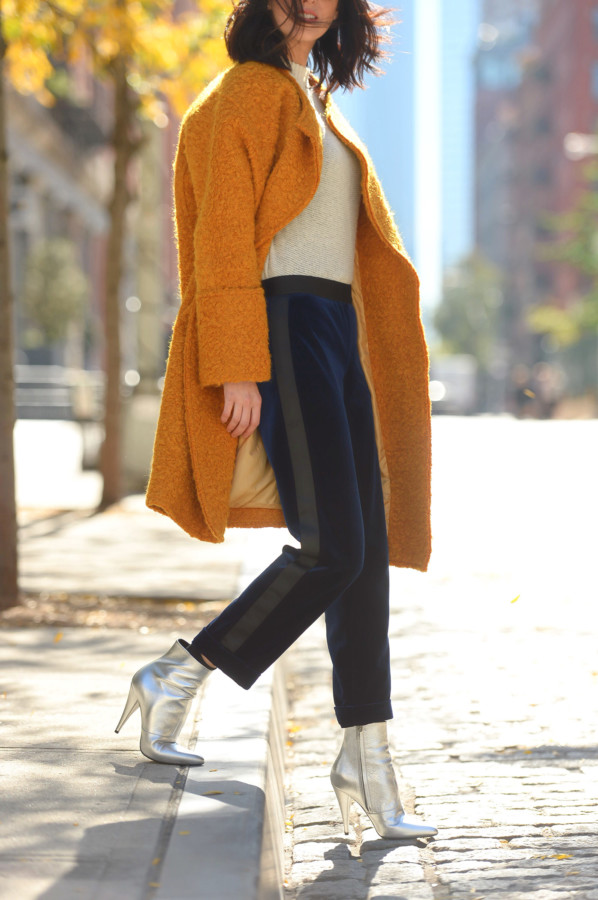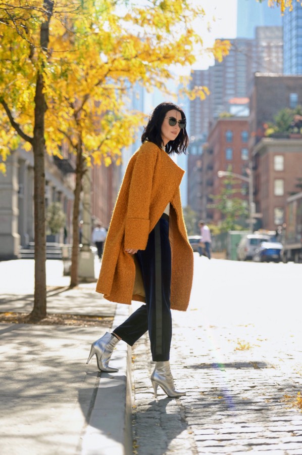 To keep with a trend-led theme, try this copper-colored oversized coat with a rich blend of wool, alpaca, and mohair that I found by Elizabeth and James. It’s seasonally appropriate brightness is a great way to shield yourself from the cooler temperatures (literally, you will feel like you’re wrapped in a warm hug). The extra large size makes it perfect for pairing with skinny-fit, blue jeans, however, there’s always a way to step things up.