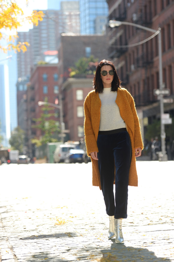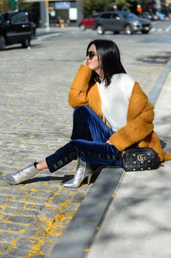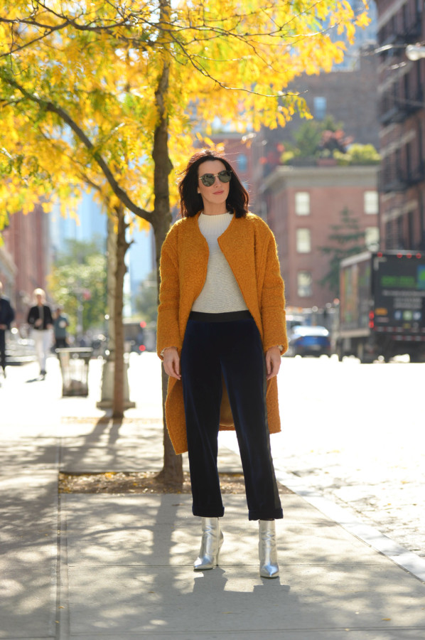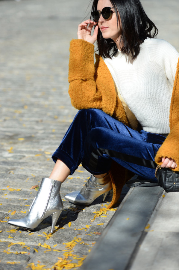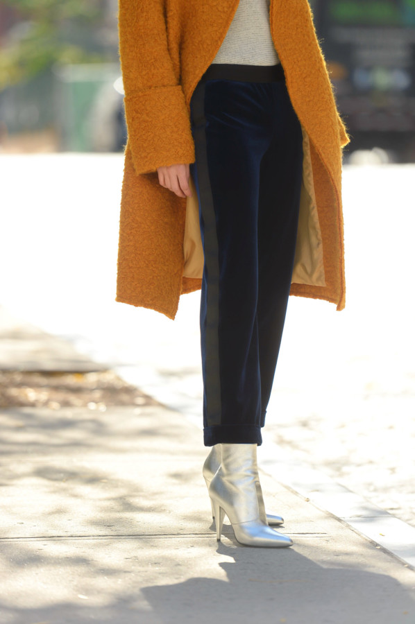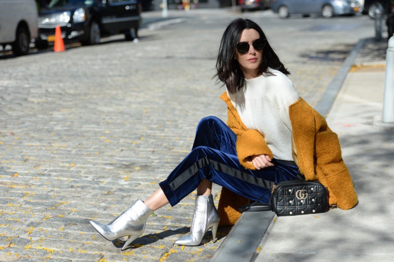 Recently, I spoke about the return of velvet, but what I forgot to mention is the variety of colors that it’s available in this year. That said, why not turn up your texture game to toasty levels with velvet pants in blue? These Bailey 44 cropped velvet pants with track stripes down the side were my first choice because they’re the best length for showing off my metallic booties (this Saint Laurent pair is from last year – here’s a similar pair available now that’s priced under $100).