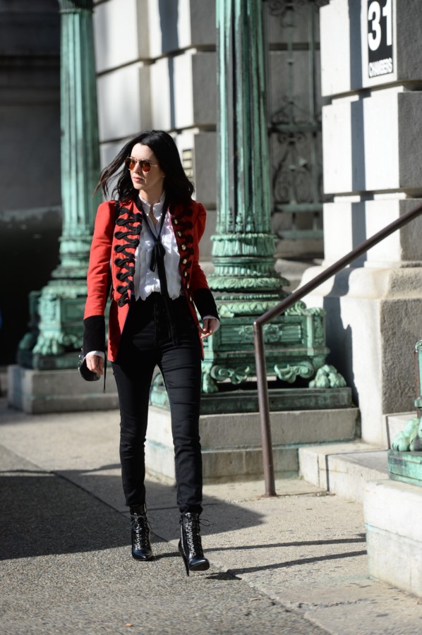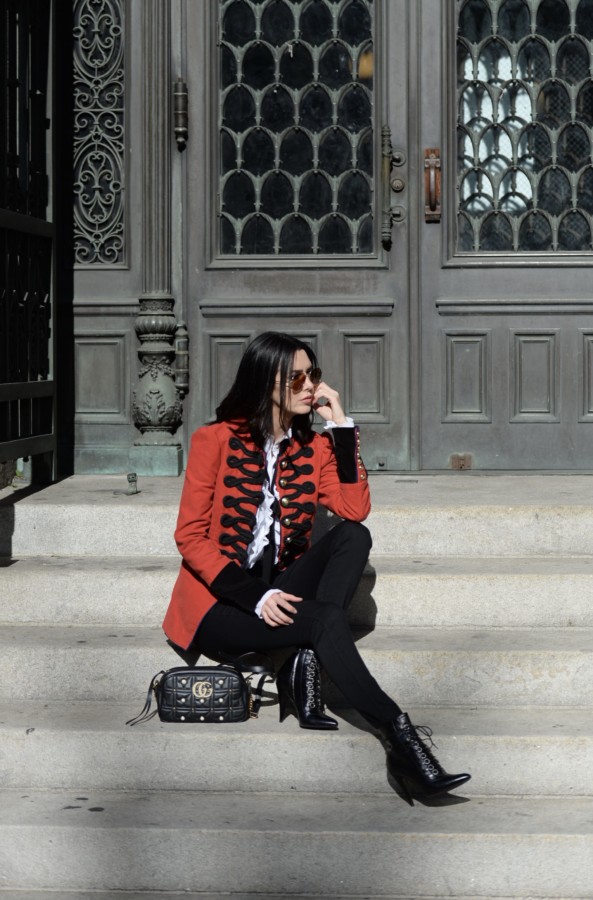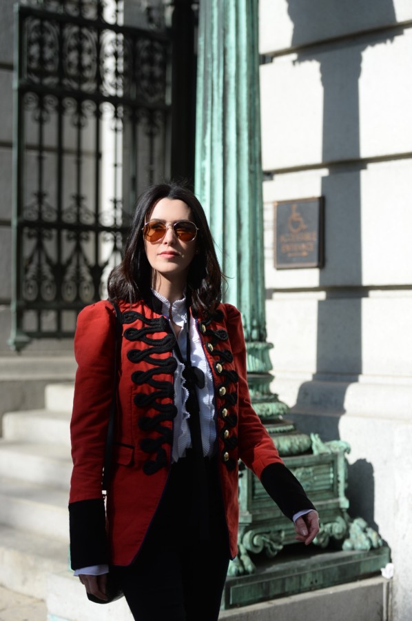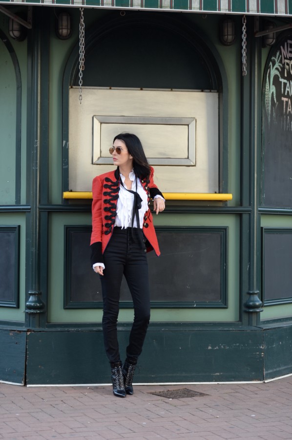 Keeping with the military inspiration, I wore my favorite pair of ultra-high waisted jeans by J Brand. The skinny fit, coupled with the sailor-style button detailing, is super flattering and looks great when worn with a tucked blouse. This Bailey44 blouse has layers of ribbed ruffles and a high neckline, but my favorite part is the long sleeves with graceful, flounced cuffs. I like to let them show when wearing the blazer. I’ve worn this top with the bow tight around the neck, however, I prefer this sort of undone way of wearing the bow loosely.