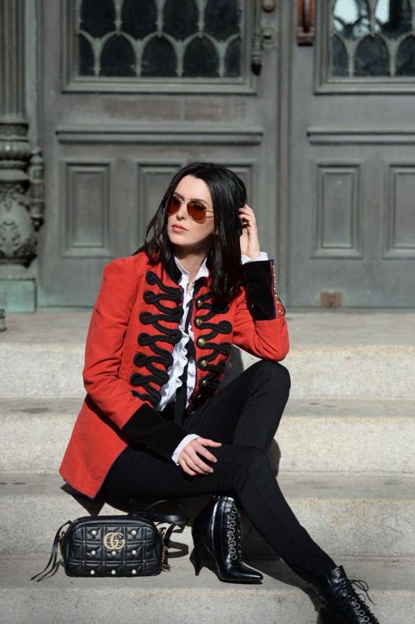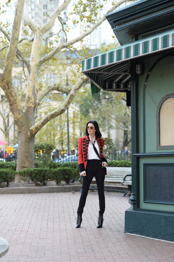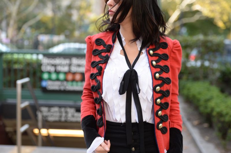 Every year, about this time, something happens to me. I seemingly go mad about military-style details. If you don’t believe me, check out my post from last year when I talked about using a military-style jacket as a layering piece, as well as a brand discovery that I had made while at Macy’s. Once again, it just so happens that recent holiday shopping has lured me back into their Herald Square store and that I again found another military-style blazer that I’m crazy about.
