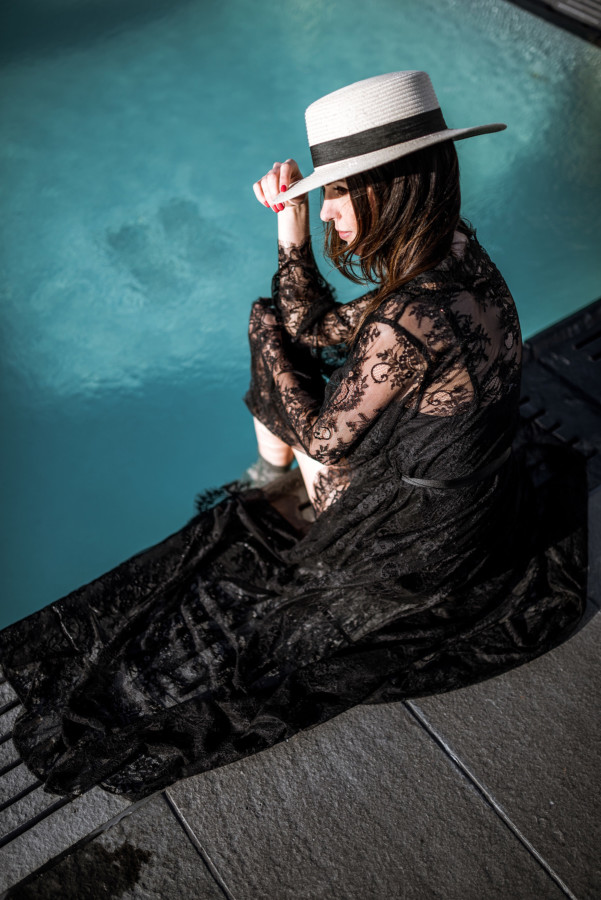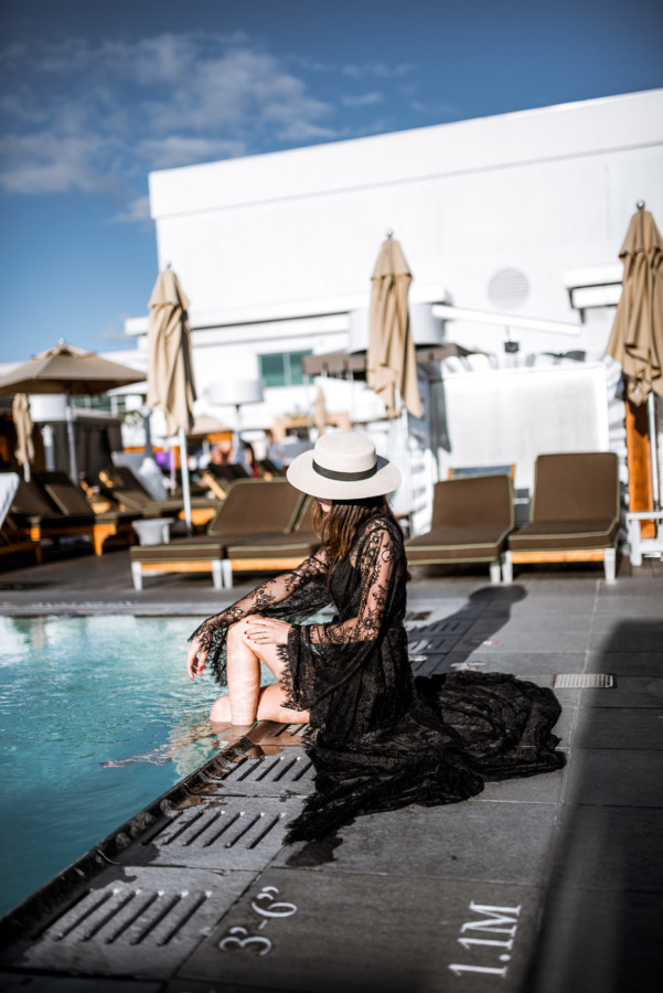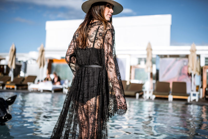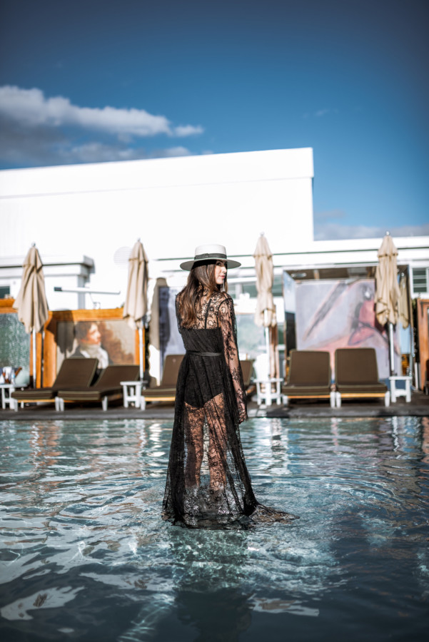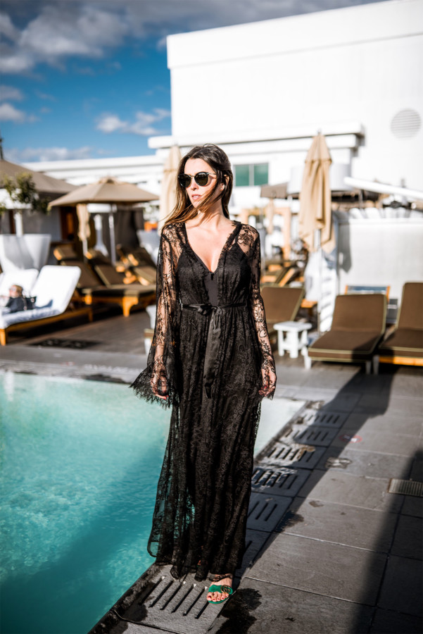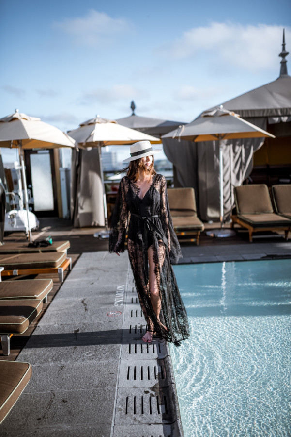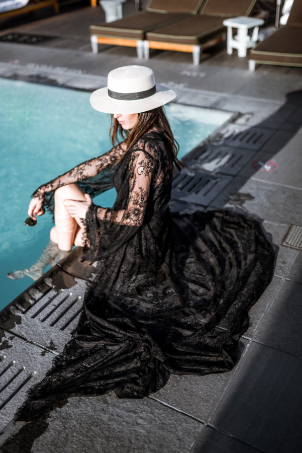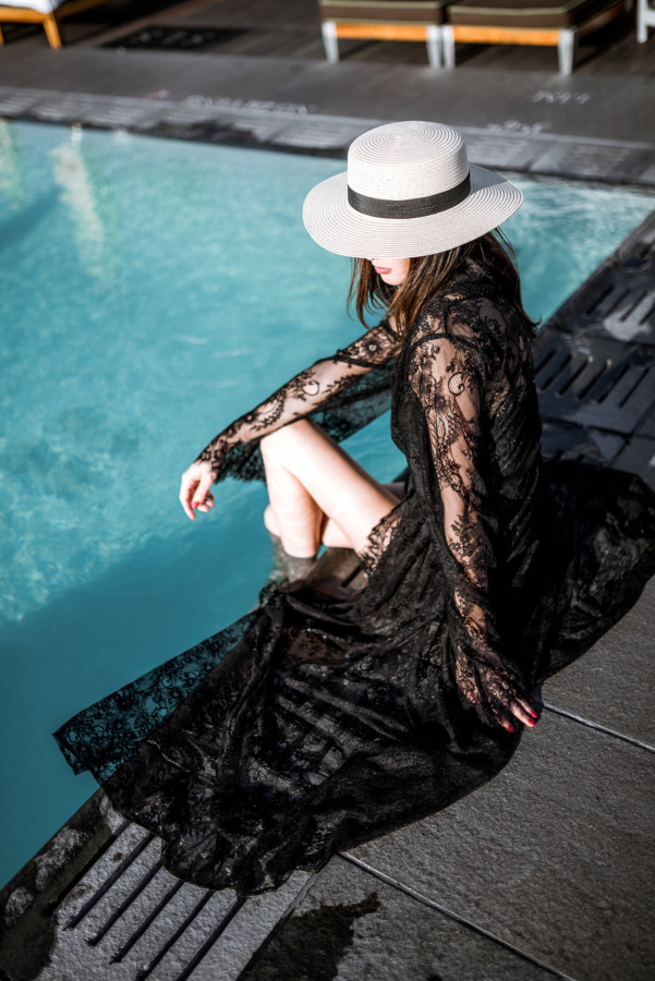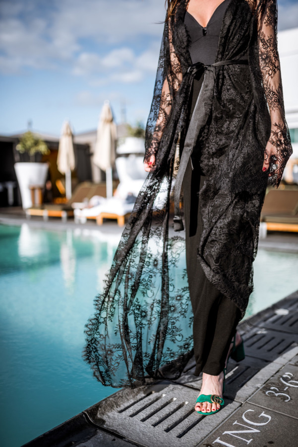 Now back to Nudwear’s new loungewear collection (here) – it’s just divine! I’ve always loved wearing a luxurious robe around the house because the femme feels are perfect for when I want to embrace my inner goddess. However, after I tried on Nudwear’s ‘Take Me To Paris’ lace robe (here) I thought this could totally take a tank worn with jeans and high-heels to the next level. The elegant robe could also make for a luxurious swimsuit cover-up when lounging poolside at a chic resort (like at the Nikki Beach Hotel in Dubai!) With thoughts of going poolside stuck in my mind, I styled the sheer floral lace with delicate scallop and eyelash trim for a sunset pool sesh at the SLS Beverly Hills during my recent stay…. talk about feeling shi-shi!!